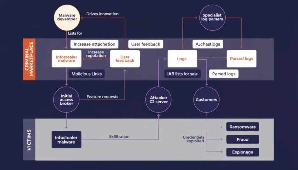 Initial Access Brokers (IABs) buy these logs, identify valuable targets (like corporate network access), and resell them to ransomware gangs or other cybercriminals. This ecosystem, powered by MaaS platforms like RedLine, LummaC2, StealC, and Vidar, makes infostealers a gateway to larger attacks like ransomware or financial fraud.